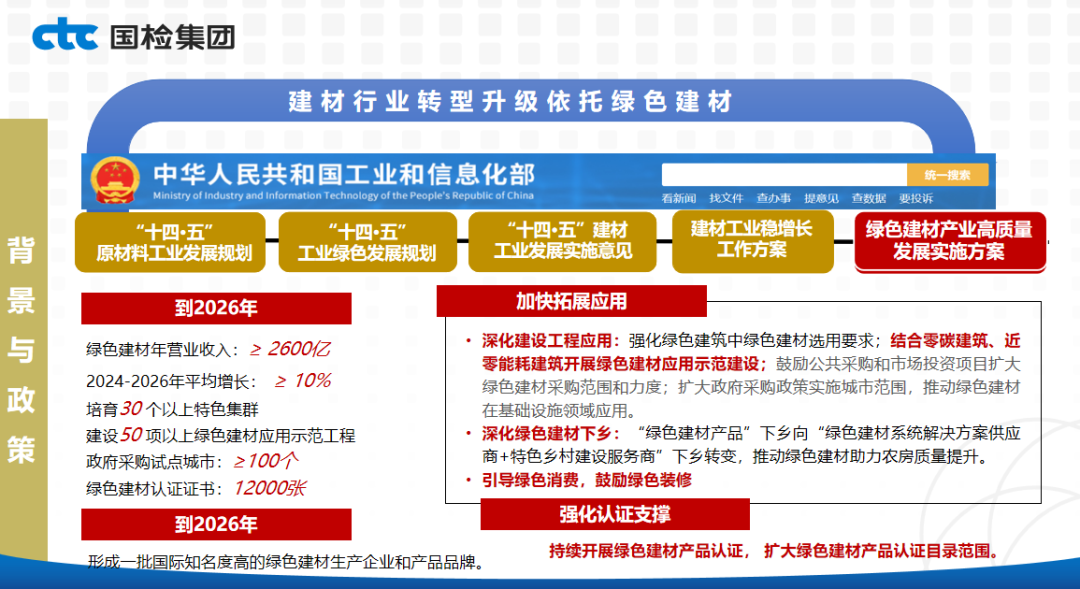 来源:国检集团 发布时间:2025-10-30近日,中国建材集团成功举办主题为“创新驱动·绿色赋能”的第六届“善用资源日”开放活动。在其中的分论坛环节,中国建材总院、北新建材等18家企业相关负责人在“新材料赋能房建与装修领域”和“新材料助力交通与能源基建升级”两个分会场围绕新材料应用场景、新能源技术创新、绿色化智能化等话题,与200余家工程企业代表共同交流各自专业领域的前沿应用实践和重点发展方向。今天为大家带来国检集团的《绿色低碳材料助力建筑业高质量发展》。