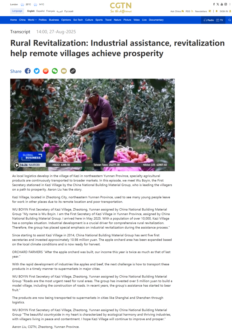 来源:CGTN 发布时间:2025-10-20超赞👍!中国国际电视台以《Rural Revitalization:Industrial assistance, revitalization help remote villages achieve prosperity》(译《乡村振兴:产业帮扶助力偏远乡村繁荣振兴》)为题,全英文整版刊发报道,图文并茂地向世界展现中国建材集团云南昭通帮扶成果。下面,跟随小料一起来看看吧~